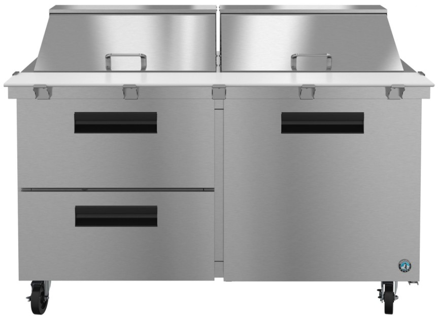 The SR60B-24MD2 is constructed of stainless steel, which protects this unit from accidental damage and rust. Plus, it is easy to clean. The SR60B-24MD2 also includes (1) epoxy coated wire shelves and (2) stainless steel drawers each with (1) divider bar, (4) 6″ stem casters (2 with brakes) are standard, plus a the drawer slides are constructed of 16 gauge stainless steel with durable acetal rollers. Electrical consumption of 4.05 kWh/day at 4 Amps, 10 ft long cord with a 5 – 15P NEMA plug. 60″ x 10″ x 0.5″ thick white polyethylene cutting board is standard. The unit is ETL Safety (US & C) Listed, ETL Sanitation, Georgia Made Certified and includes a 7-7-7 Warranty (seven years labor, seven years parts, seven years compressor — visit hoshizakiamerica.com/support/warranty for eligibility information).