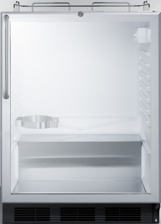 Sized at 32 inches high, the SBC56GBINKCSSADA is designed to fit under lower ADA compliant counters. The front-breathing design allows built-in installation, while the stainless steel wrapped cabinet also enables freestanding use. This unit features a double pane tempered glass door for a full display of the interior. A factory-installed lock is conveniently located towards the top of the door for added security and a curved towel bar style handle in brushed stainless steel completes the look. We include a guard rail (ships uninstalled) and removable two-piece stainless steel drip tray for cleaner service. The SBC56GBINKCSSADA does not include any tapping equipment, allowing "do-it-yourselfers" to customize their draft system.